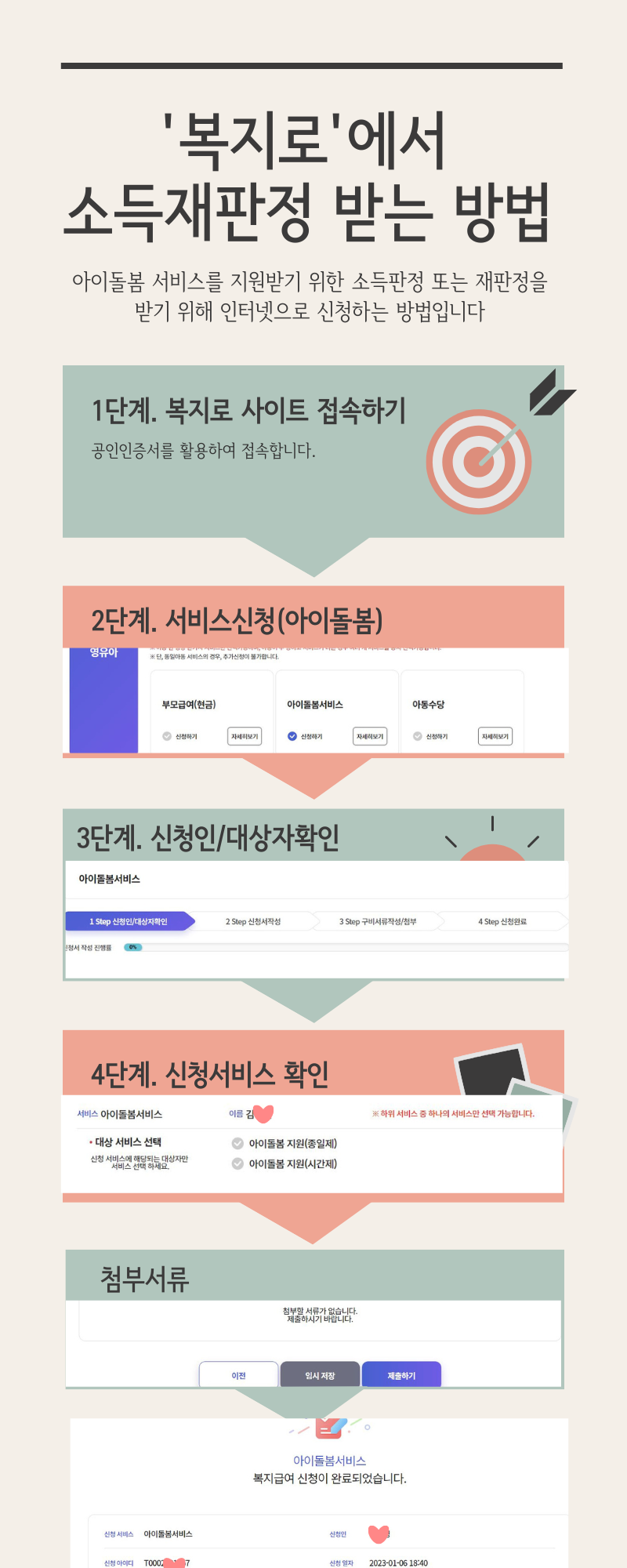 총 4단계로 이루어져 있는데 순서대로 따라가시면 됩니다. 이 부분은 어렵지 않습니다. 신청하고자 하는 부모와 이용하려는 아이들의 개인정보를 확인하면 됩니다. 종일제를 이용할 것인지, 시간제를 이용할 것인지도 잘 생각하시고 신청하시기 바랍니다. 잘못 신청해서 추후에 불이익을 받지 않기를 바랍니다. 첨부서류를 제출하는 탭이 나옵니다. 공인인증서로 접속하고 개인정보를 조회할 수 있도록 동의하였기 때문에 필요한 첨부서류가 있다면 제시해 줍니다. 우리 집은 부부 모두 소득이 공개되는 직업이다 보니 첨부서류가 필요 없었습니다. 그래서 바로 신청서를 제출하면 되었습니다. 첨부서류가 필요한 가정에서는 꼼꼼하게 준비하여 업로드하시거나 직접 주민센터에 제출하시면 됩니다. 그러면 사진과 동일하게 '아이돌봄서비스 복지급여 신청이 완료되었습니다'라는 문구가 나옵니다. 이렇게 되면 소득 재판정 신청이 끝납니다. 그리고 기다리면 됩니다.